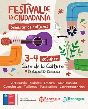 Una invitación a vivir nuestra identidad cultural con diversidad y participación es el llamado del Festival de la Ciudadanía “Sembramos cultura”, iniciativa impulsa la Seremi de las Culturas de la región de O’Higgins, que se realizará este viernes 3 y sábado 4 de octubre, con presentaciones musicales, talleres y exhibiciones audiovisuales gratuitas en la Casa de la Cultura de Rancagua.