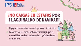 El Instituto de Previsión Social (IPS) informa a las personas pensionadas que el Aguinaldo de Navidad, que beneficia a más de 2 millones 800 mil personas a nivel nacional y a más de 148 mil pensionadas y pensionados en la Región de O’Higgins, solo se paga automáticamente -junto con la pensión del mes- a quienes cumplen los requisitos, y no se deben ingresar datos a un enlace o sitio web para solicitarlo.